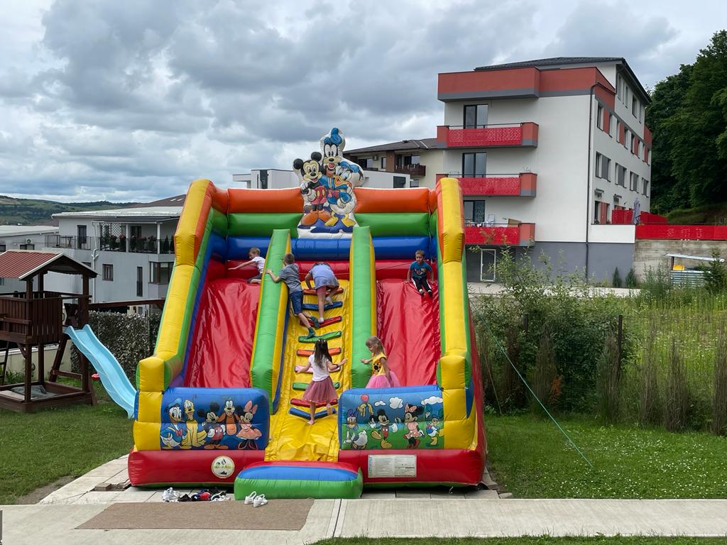 acum 4 aniLocație pentru organizare zi de naștere copil foarte bună. Spațiu suficient de mare de joaca în exterior (îngrădit) cu tobogan, leagăn, trambulina, la cere am înțeles ca exista și tobogan gonflabila. Copii au fost ținuți ocupați de doua domnișoare foarte drăguțe (plătite extra fata de prețul de închiriere) prin jocuri, dansuri. Recomand!