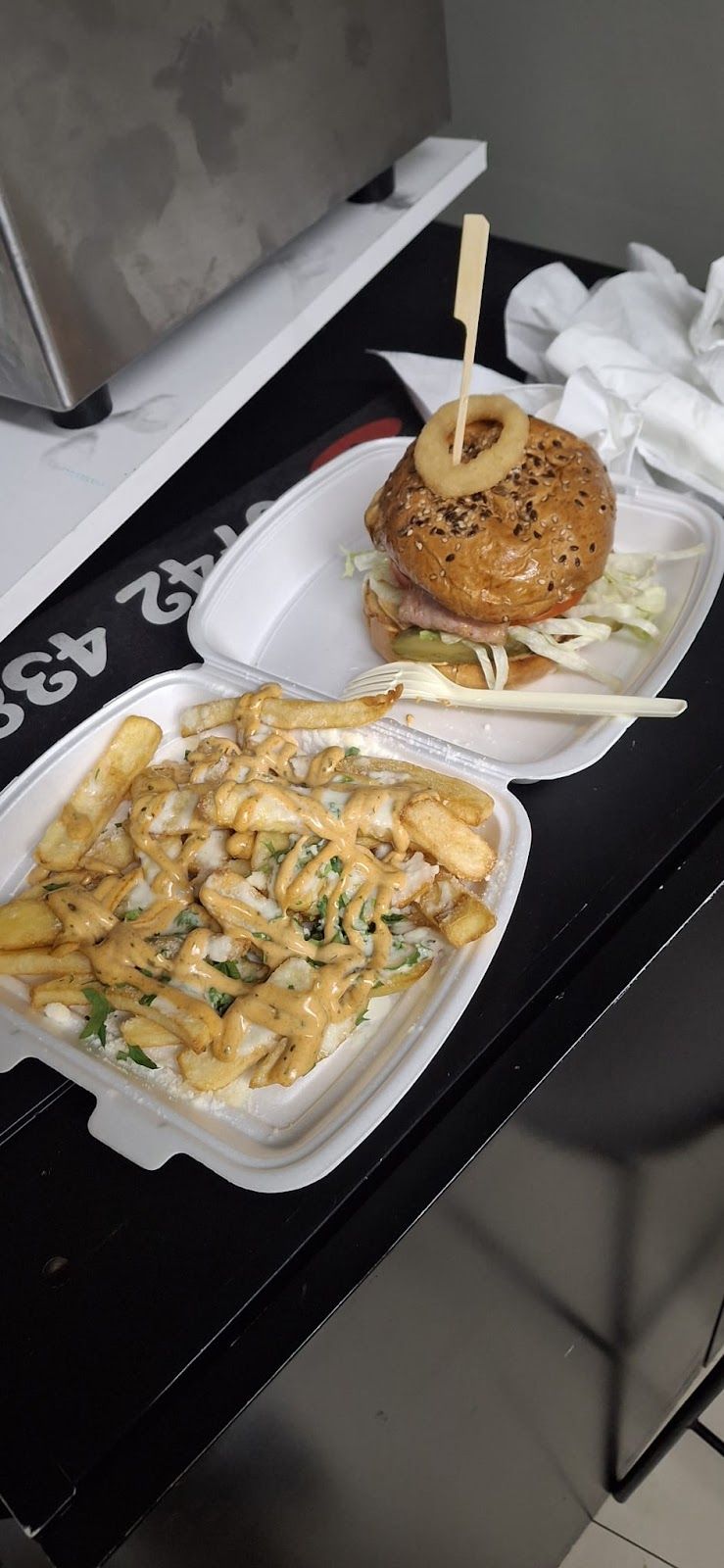 Mancarea a venit dupa o ora, timpul de livrare tot crestea pe Glovo. Am sunat la ei sa ii intreb cand vine mancarea. Mi s-a spus ca livratorul a plecat de 40 min de la ei si ca urmeaza sa ajunga. Mancarea a venit rece, servita intr-o cutie de carton, era un gyros, legumele deja trecusera prin cutie fiind umede, puiul pe langa zgarciuri si oase, mai avea si gust de peste. Cartofii reci, se intorsesera in starea lor initiala de cartofi congelati. Oribil. Scarbos. De nemancat.