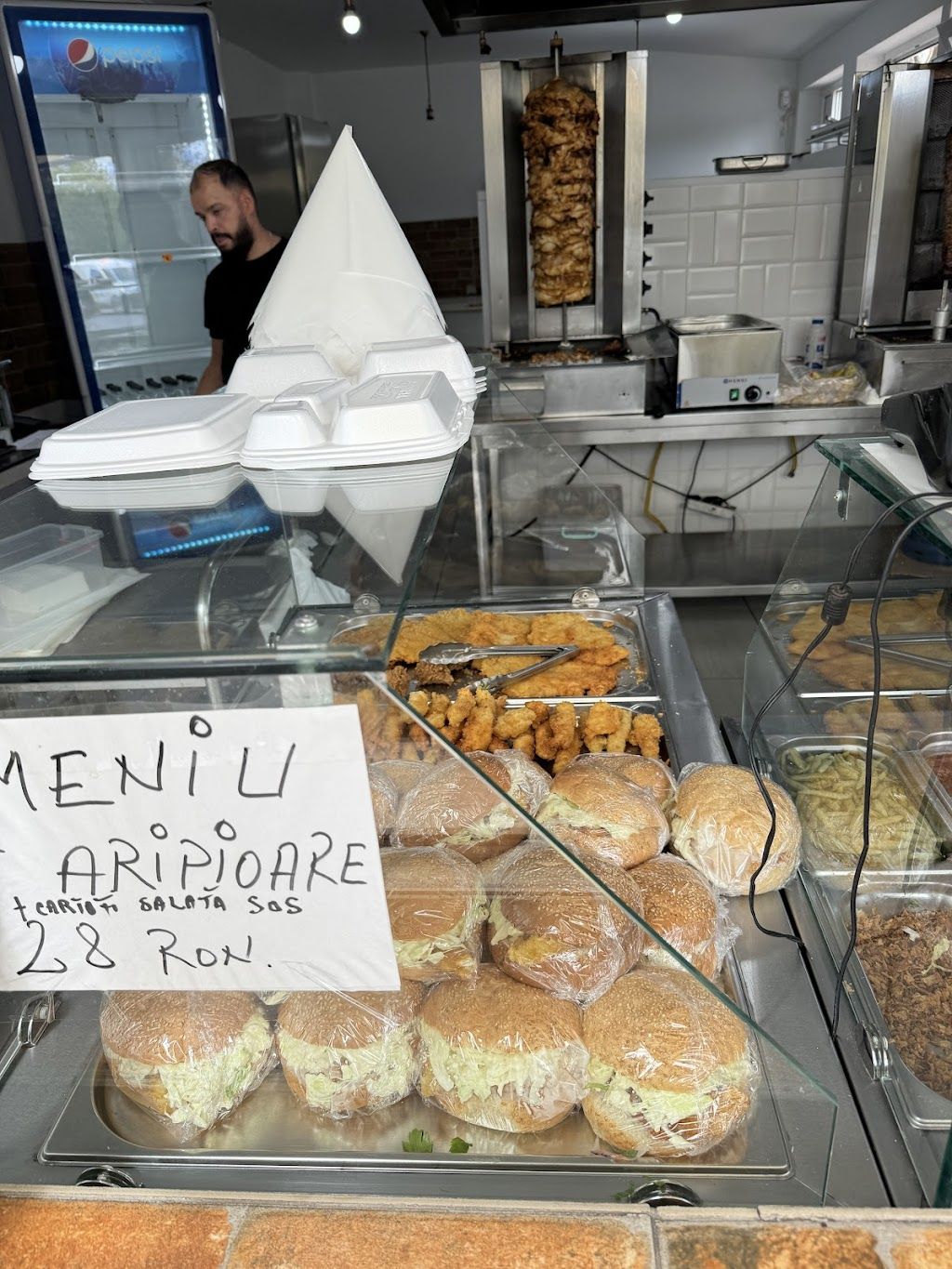 personal beat, am cerut 2 meniuri crispy, ni s a oferit o singură porție după ce am cerut de două ori,prima dată a uitat, credea ca pur și simplu stăm în fața shaormeriei, jumătate din porția de cartofi a fost scăpată în sosuri și lăsați acolo, carnea era rece, ambalat în scârbă, nu recomand absolut deloc.
