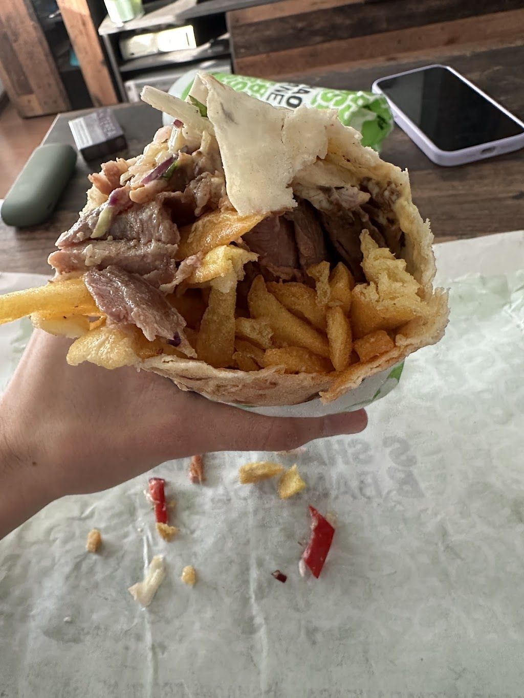 acum un anAm dat doua stele că baietasii si-au asumat că au gresit ! Am comandat de pe Tazz de la ei , trecuse 25 de minute de cand am dat comanda si cand am ajuns sa o ridic personal , nu era gata, au inceput sa o faca fix cand am ajuns, in fine lasând acest lucru deoparte Calitatea shaormei merita -1 stele! Cartofii erau reci abia scosi parca din congelator doar putin bagati la cuptor si gata, carnea era saraca , rosiile erau stricate cu gust de statut , am fost 3 insi de am dat comandă si la fiecare erau aceleasi probleme , sa mai zic ca am gasit si pietre de am crăntănit in dinti parca nisip ? Nu port pica pe ei dar trebuie sa stie viitorii clienti ce se intampla! Multumesc! Zile bune